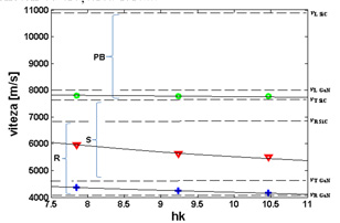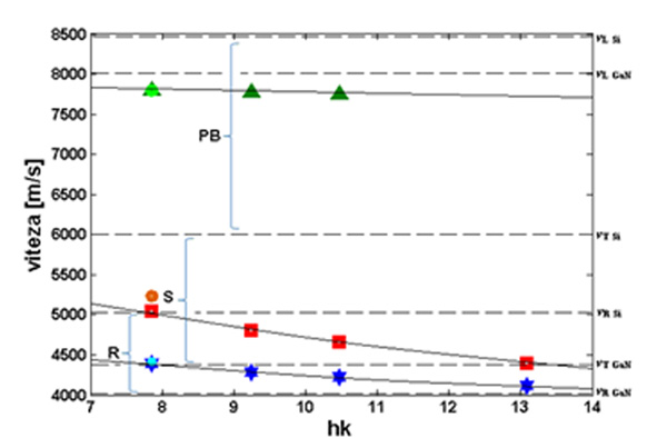 Cunoscând vitezele de propagare obținute pentru modul Rayleigh, precum și valorile vitezei transversale din SiC și din GaN, evidenţiate în Fig 2 prin linie punctată, rezonanțele obţinute au fost asociate modurilor Rayleigh (R), Sezawa (S) și pseudo-bulk (PB). În Fig. 2 este prezentată variația vitezei de propagare pentru cele trei moduri posibile, în funcție de grosimea normată a stratului de GaN crescut pe substratul de SiC, pentru cele trei tipuri de structuri SAW.