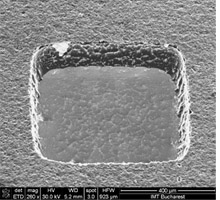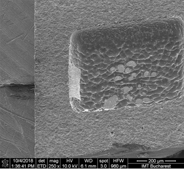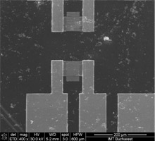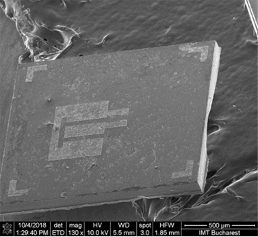 Imaginile de microscopie electronica, obtinute cu SEM Scanning Electron Microscope - Vega II LMU (TESCAN), ale unei structuri SAW de tip “face to face” pe membrana de GaN (aria membranei de 500 μm x 500 μm) sunt prezentate în Fig.2.