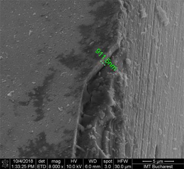 Odată realizate tehnologic, structurile au fost caracterizate morfologic cu echipamentul Scanning Electron Microscope - Vega II LMU (TESCAN). În Fig.1 (b) este prezentată imaginea SEM a unei structuri SAW fabricată pe plachete de GaN/Si având lățimea/spațierea dintre digit/interdigit de 200 nm şi o lungime de 100 μm.