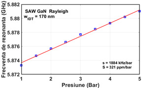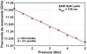 S-au analizat structurile SAW suspendate pe o membrană de GaN cu aria de 500 μm x 500 μm cu lățimea/spațierea dintre digit/interdigit de 170 nm pentru modurile Rayleigh si Lamb. Se poate observa ca frecvența de rezonanță pentru modul Rayleigh crește odată cu creșterea presiunii (Fig. 3 a). Din aproximarea liniară a variației frecvenței de rezonanță cu presiunea (Fig. 3 a) am obținut o sensibilitate de 321 ppm/Bar.