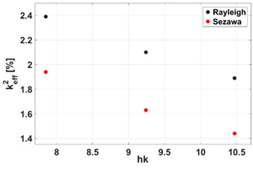 Fig.4 Comparație între valorile lui k2eff determinate experimental pentru modurile Rayleigh și Sezawa pentru structurile SAW pe GaN/SiC |