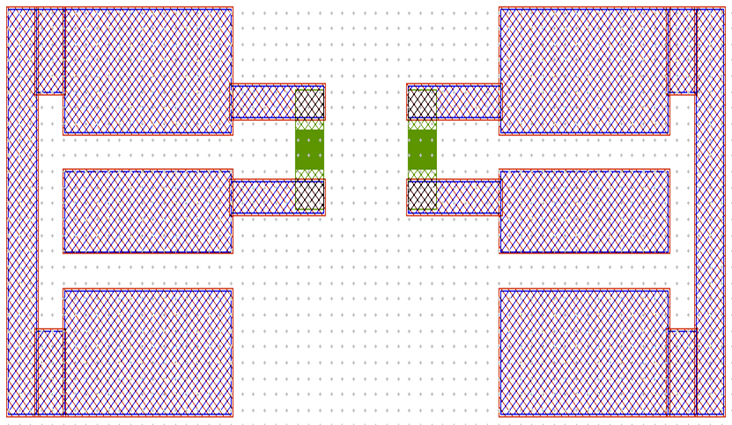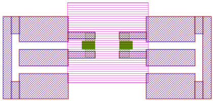 Designul măştilor a fost realizat pentru structurile SAW de tip “face to face”, utilizând programul dedicat, CleWin. Măştile au fost realizate în IMT Bucureşti, pe echipamentul DWL 66. Superpoziţia celor trei măşti proiectate este prezentată în Fig.1 (a) pentru structurile pe baza de GaN/Si si in Fig.1 (b) pentru structurile de baza de GaN/SiC.