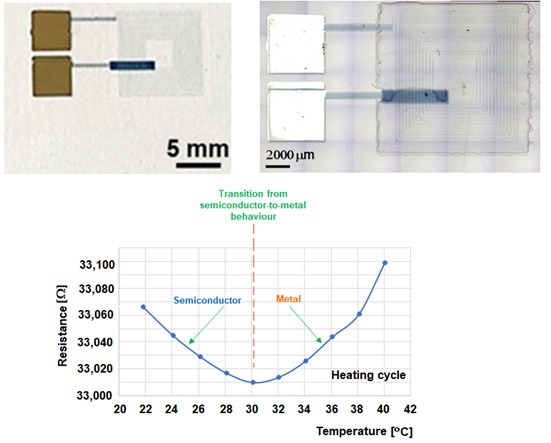 The resistance-vs.-temperature variation of the PEDOT:PSS planar inductor embedded in epoxy (bottom).