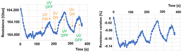 Graphs showing the resistance variation of the ZnO-polymer UV sensor under illumination with radiation at 295 nm. Left: absolute resistance values; Right: relative variation of resistance. The resistance increases at illumination, as expected from sensors using the devised sensing principle. The sensor has a responsivity of 2 Ohm/W or, equivalently, 0,5 S/W.