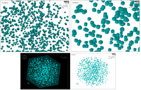 CAD model of the particles used for the composite simulation. Top left: the shape and space distribution of the particles inside the composite; Top right: detail showing the shape of the particles; Bottom left: the spatial distribution of the particles in the cube of composite; Bottom right: the same image, but without the representation of the cube.