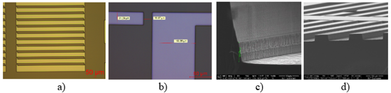 Fig. 3 Imagine optică-detalii de pe o structură procesată fotolitografic: a)-modul cu µCS, b)- ancora de prindere; imagimile SEM detaliu de gravura a Si <111> cu un proces de tip Bosch, c)- în spațiul dintre µCS și -d) modul cu µCS dupa corodare c-Si. Obținerea de µCS individuale integrate în rețele suspendate, ancorate de substratul de Si <111> folosind corodarea anizotropă a Si <111> in solutia de TMAH.