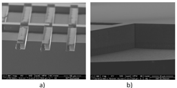 Fig. 4 Imagini SEM: a) µCS individuale integrate în rețele suspendate, ancorate de substratul de Si <111>, b) ancora de prindere a µCS -detaliu